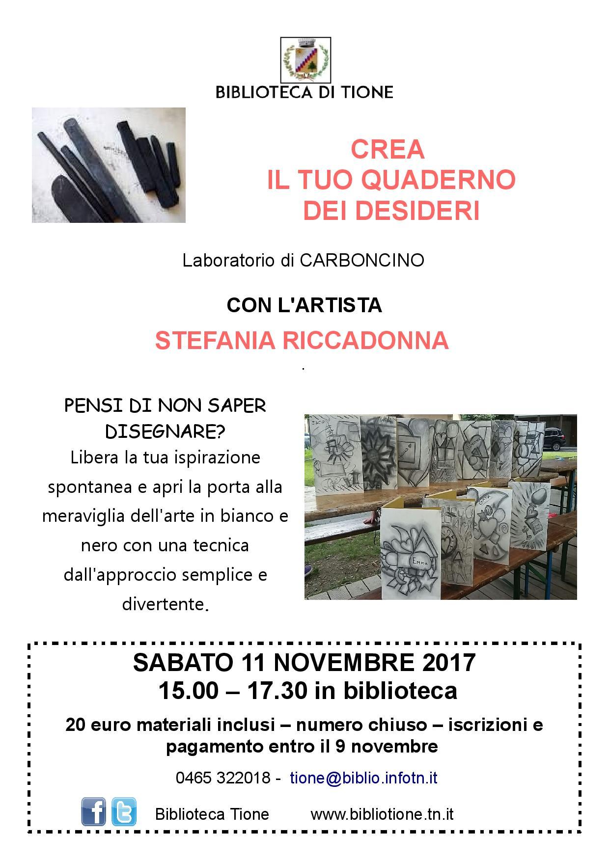 Il carboncino è una tecnica che permette anche a chi non ha competenze nel disegno di realizzare dei lavori d'effetto. Guidati dall'artista Stefania Riccadonna i partecipanti potranno realizzare un quaderno dei desideri con la copertina personalizzata.