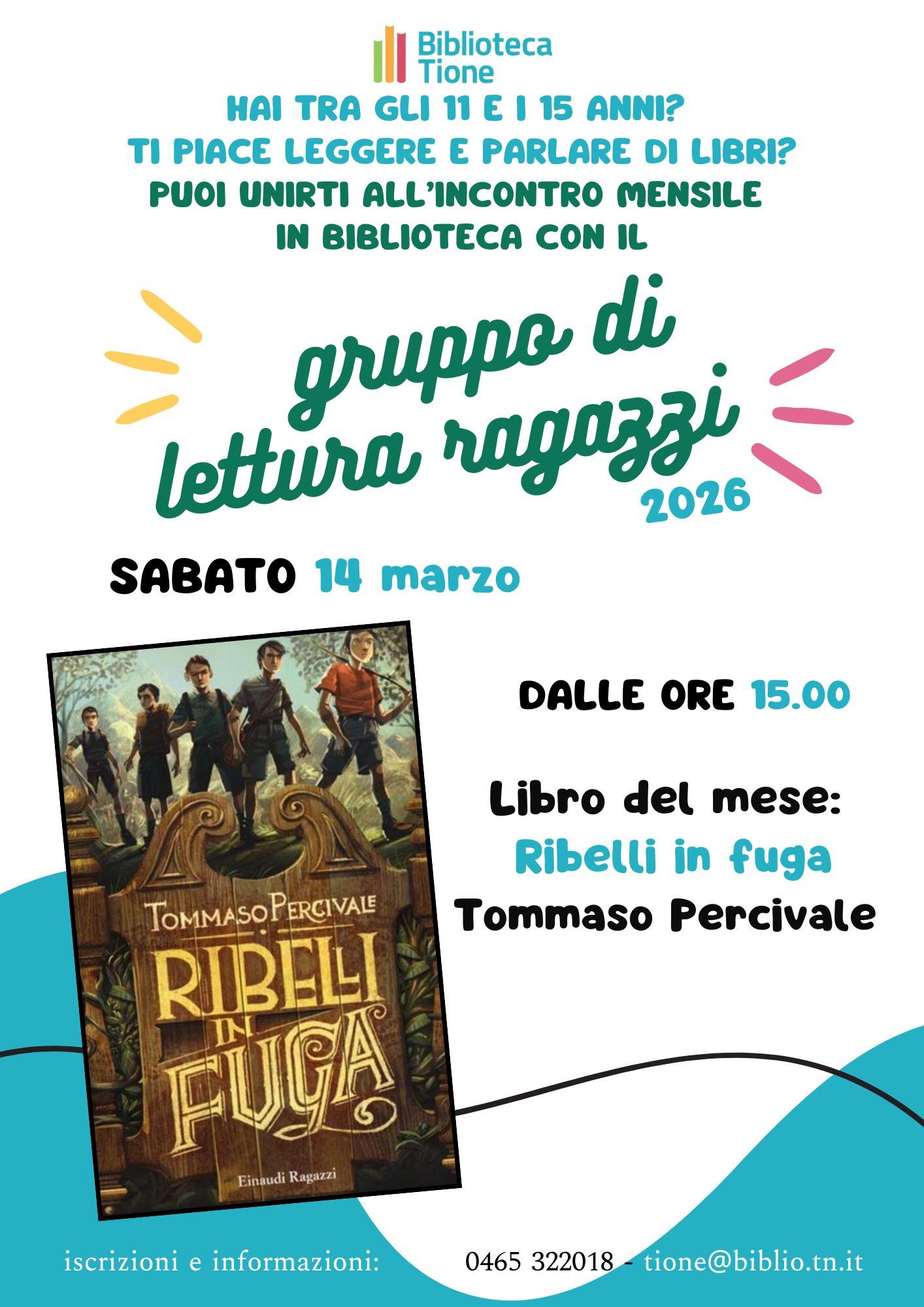 Il libro del mese sarà Ribelli in fuga di Tommaso Percivale, un romanzo avventuroso e coinvolgente che racconta di amicizia, coraggio e spirito di ribellione. Una storia dinamica e appassionante, capace di far riflettere sul valore della libertà, delle scelte e della forza del gruppo.