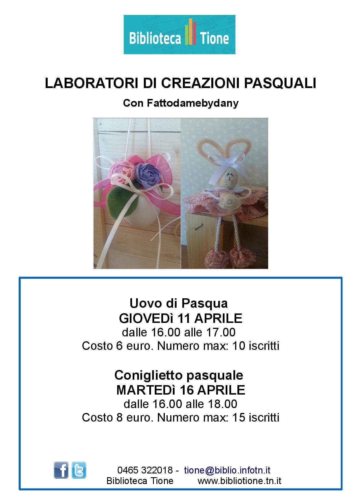 Proponiamo due laboratori di creazioni pasquali con Daniela Botteri. In questo primo laboratorio si preparerà un uovo di Pasqua. L'iscrizione è richiesta entro mezzogiorno di mercoledì 10 aprile e il costo per i materiali è di 6 euro.