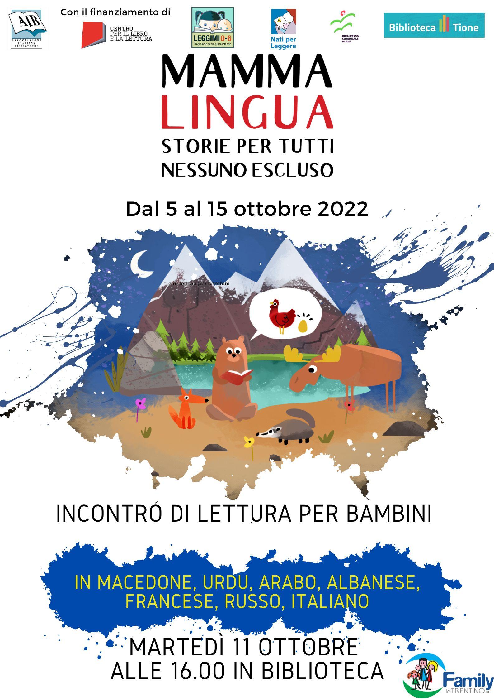 Dal 5 al 15 ottobre ospitiamo la valigia di libri itinerante messa a disposizione dalla biblioteca di Ala, presidio trentino per Mamma lingua. Ogni bambino dovrebbe ricevere nutrimento dalle parole della propria lingua d'origine. Martedì 11 ottobre ospitiamo in biblioteca letture in Macedone, Urdu, Arabo, Albanese, Francese, Russo, Italiano.