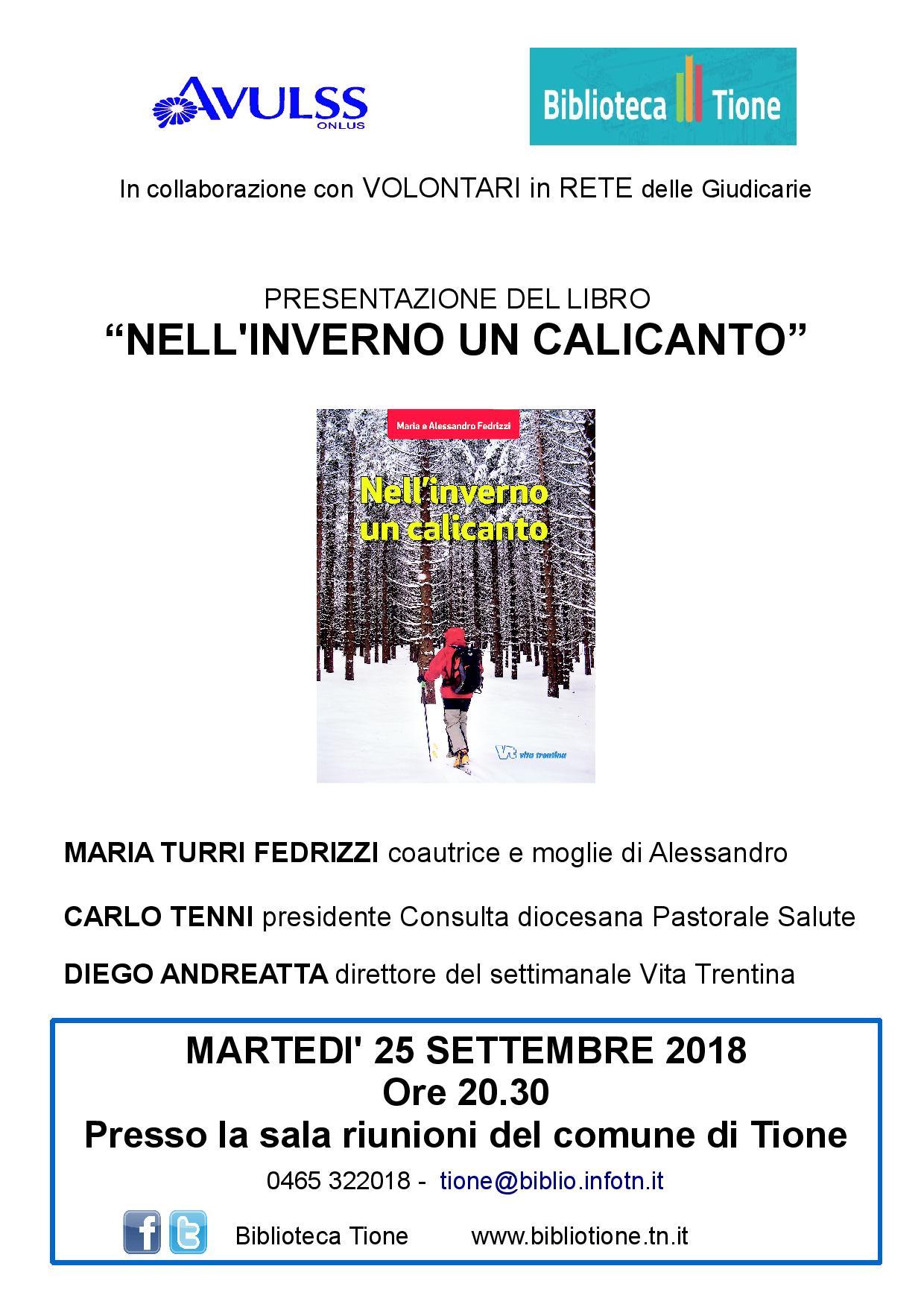 In collaborazione con AVULSS e con Volontari in rete delle Giudicarie organizziamo la presentazione del libro "Nell'inverno un calicanto" di Maria e Alessandro Fedrizzi. La storia di un percorso interiore di accettazione della malattia come prova di vita e riscoperta del valore delle relazioni. Saranno presenti Maria Turri Fedrizzi (coautrice e moglie di Alessandro) Carlo Tenni (presidente della Consulta diocesana Pastorale Salute) e Diego Andreatta (direttore del settimanale Vita Trentina). L'incontro si svolgerà martedì 25 settembre 2018 alle 20.30 presso la sala riunioni del comune di Tione.