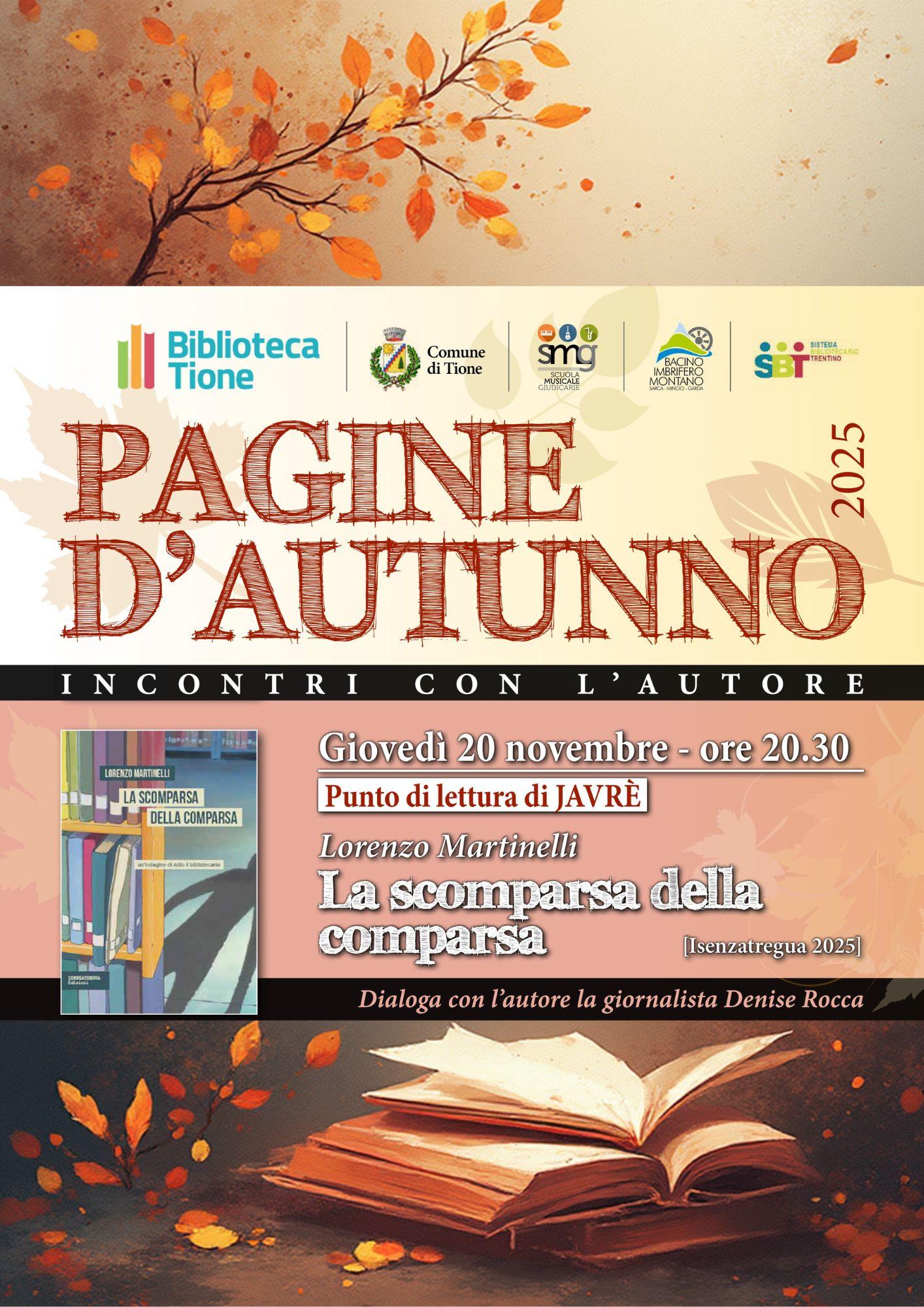 La rassegna Pagine d’Autunno 2025 prosegue con Lorenzo Martinelli, che presenterà il suo romanzo La scomparsa della comparsa (Isenzatregua, 2025). Un “cozy crime” ironico e sorprendente, dove un mistero di paese accende un’indagine fatta di intuizioni, memoria e personaggi fuori dagli schemi.