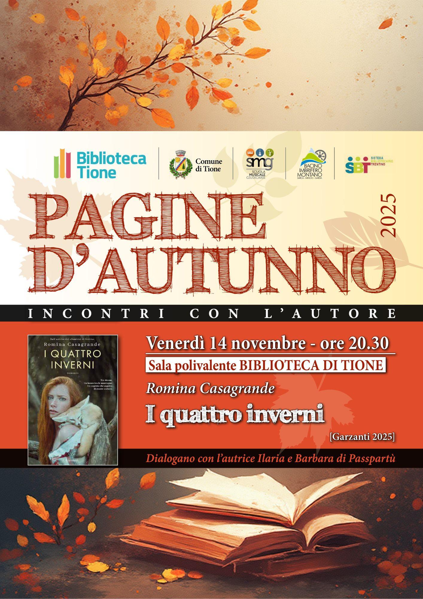 La rassegna Pagine d’Autunno 2025 prosegue con Romina Casagrande, che presenterà il suo nuovo romanzo I quattro inverni (Garzanti, 2025)Un viaggio tra le montagne cariche di mistero e silenzi, dove donne e bambini sono nascosti in una fattoria remota: segreti antichi che chiedono verità.